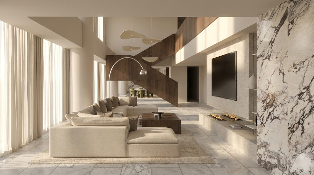 Interiors feature a refined material palette of warm wood, luxurious marble, and soft textiles, combining elegance with comfort. Open-plan layouts enhance connectivity between spaces, while bespoke furniture and integrated storage maintain practicality and visual harmony.